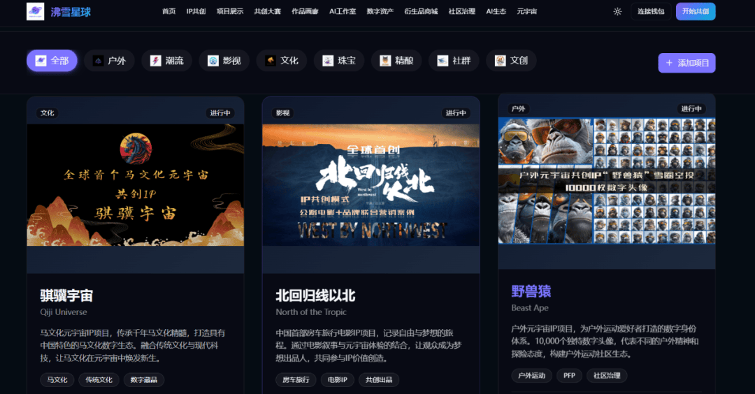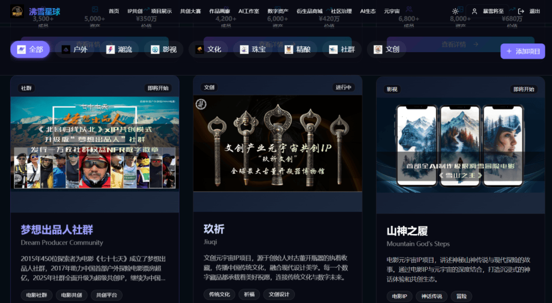 项目介绍:北京沸雪户动文化传播有限公司创始团队拥有多年户外、影视产业创业经历,公司聚焦 Web3 时代品牌数字化营销模式探索,聚焦户外运动、潮流文化、影视娱乐产业赛道,通过 AI 技术+共创社区+IP 数字资产链上确权为品牌提供从虚拟 IP、智能体 IP 到元宇宙 IP 的 IP 共创模式服务。目前正在执行中的项目有:马文化元宇宙 IP「骐骥宇宙」、电影社群 IP「梦想出品人」、户外元宇宙IP「野兽猿」、潮玩智能体IP「加密江湖」、钻石元宇宙 IP「克拉兔」等,同时公司正在设计中国首个元宇宙 IP 共创营销平台「沸雪星球」,计划 2026 年 1 月上线运营。
