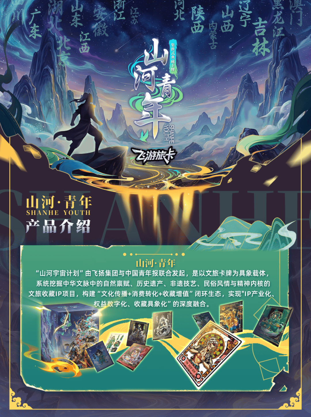 项目介绍:为响应共青团中央「激发青年文化创新活力、推动文化强国建设」的号召,立足卡牌潮玩(2024 年市场规模263亿元,年复合增长率56.6%)与文旅产业(万亿级消费市场)的融合风口,飞扬集团(内地首家港股上市旅游公司)与中国青年报(全媒体用户超 3.2 亿)于 2025 年 12 月 8 日正式启动「山河宇宙计划」,打造「全民共创、数实融合、文化赋能」的开放式文旅 IP 生态。计划以「山河·青年」系列权益型潮玩卡牌为首发载体,深挖中国 34 个省级行政区文旅元素,打造 340 个青年化拟人角色,通过 NFC 芯片+合规联盟链技术,实现「实体卡牌-数字资产-文旅权益」无缝衔接。后续将拓展「山河·吃货」「山河·非遗」等多元系列,延伸至文创、动漫、影视等多形态载体,构建百亿级文化消费生态。